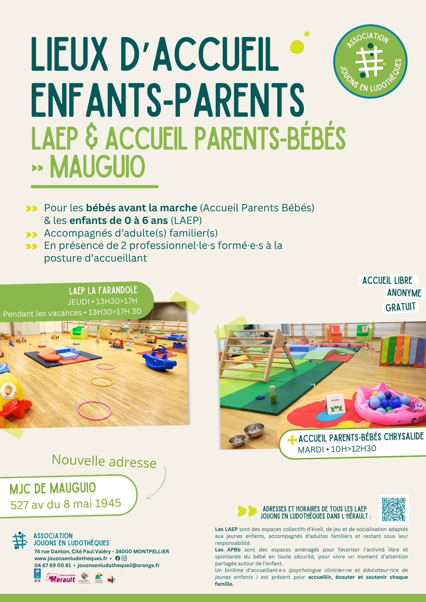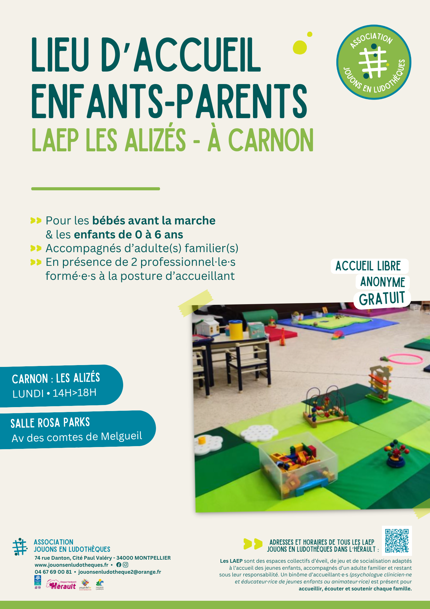 Libre, anonyme et gratuit, un Lieu d’Accueil Enfants/Parents (LAEP) est un lieu de jeu, de rencontres, d’échanges et de découvertes, entre parents et enfants, où se retrouvent femmes enceintes, parents et enfants de 0 à 6 ans, voire amis et famille élargie, dans un lieu adapté à tous.