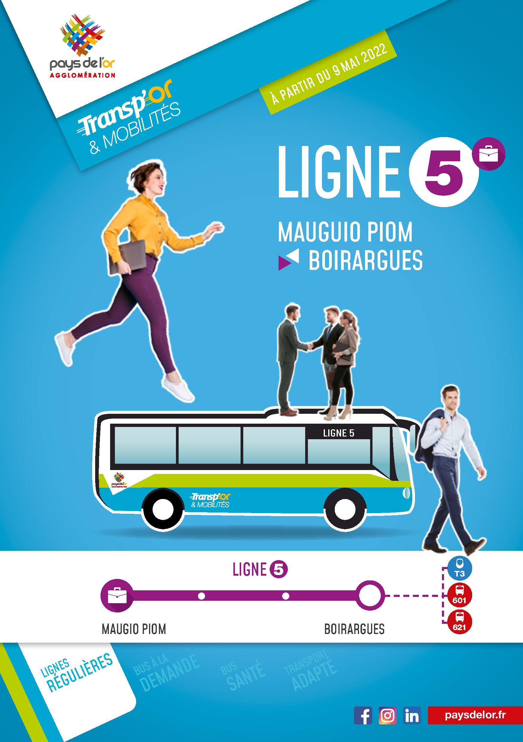 La ligne 5 relie le Parc Industries Or Méditerranée de Mauguio (arrêt PIOM) et la zone d’activités de Fréjorgues (arrêts Fréjorgues Est et Rond-Point de Figuières) à la ligne 3 du tramway à Boirargues (arrêt Boirargues), du lundi au vendredi, hors jours fériés.